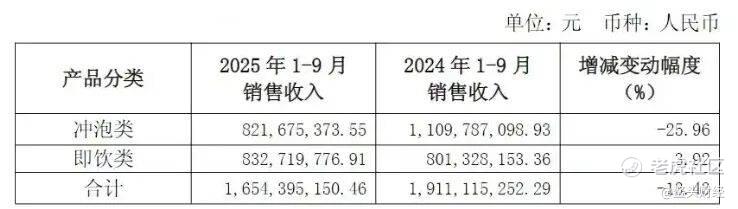 一方面,核心支柱冲泡业务的衰退已进入加速期。冲泡类产品收入一季度下滑37.18%,前三季度同比下滑25.96%,看似有所缓和但难掩下降趋势。