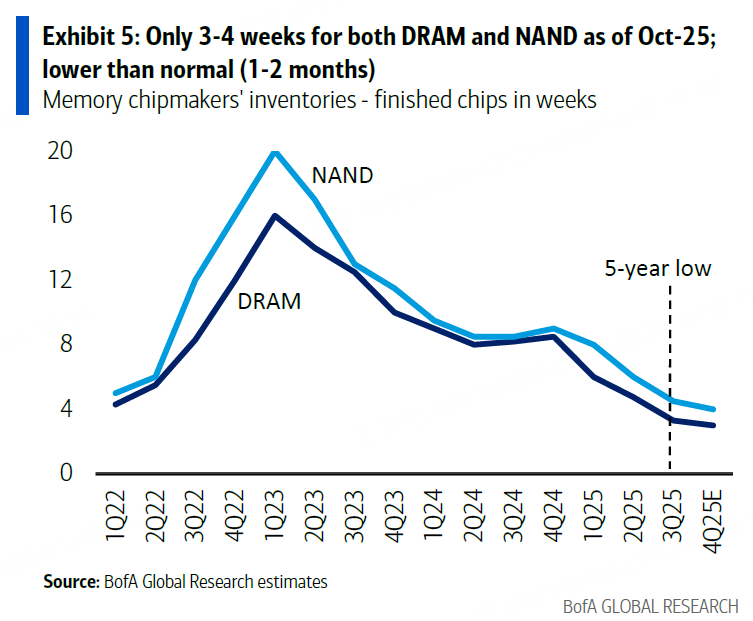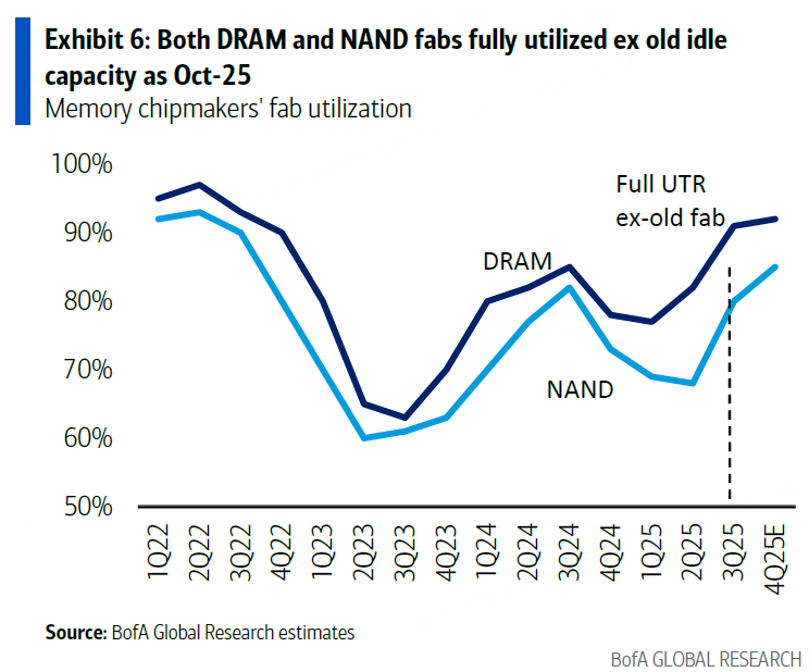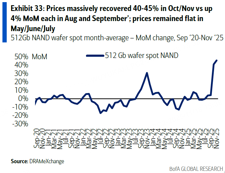 $美国银行(BAC)$ 最新发布的全球存储技术报告指出,2025年下半年起,存储行业正式告别此前的调整周期,迈入结构分化的复苏阶段。NAND市场率先步入中上行周期,DRAM在高带宽内存(HBM)的强力驱动下增长强劲,但平均售价(ASP)上涨幅度受限,而韩国半导体设备与材料类小盘股则面临多重增长压力。当前,行业核心增长动力已从传统存储转向HBM,叠加下游服务器、固态硬盘(SSD)等终端需求持续复苏,存储行业正迎来“强者恒强”的格局重塑。 $美光科技(MU)$ $SanDisk Corp(SNDK)$ $西部数据(WDC)$