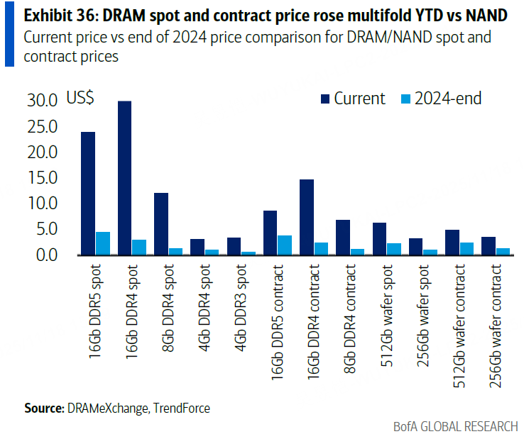 DRAM市场呈现“量价齐升”态势,但增长结构高度集中于高附加值领域。2025年第四季度,DRAM现货价格延续暴涨趋势,16Gb DDR5周涨幅达17%,季度涨幅逼近300%;16Gb DDR4现货价格同比暴涨超970%,创下25年来历史峰值。但与现货市场的狂热不同,合约价上涨相对温和,美银预测2025年第四季度DRAM ASP涨幅在13%-18%之间,难以达到市场传闻的30%至40%。