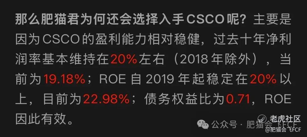 当时还提到某位美股科技股博主的观点:CSCO过去5年涨幅仅5%,不值得投资。当时肥猫买入的股价区间正是45~48美元之间。而一年后,随着AI东风吹起,该博主又认为CSCO值得买入,而过去一个月的股价已经在70~78美元之间。