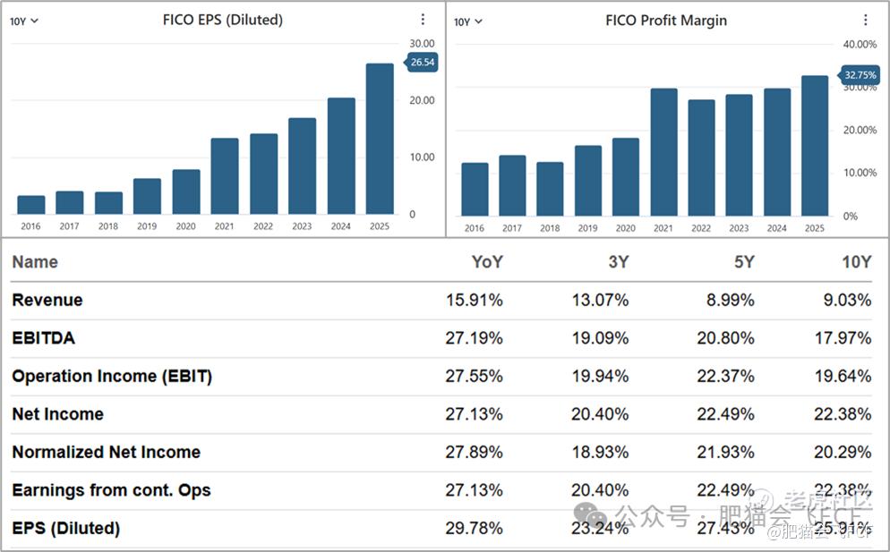 对 FICO: 护城河在于评分模型的历史积累与监管认可度。其核心地位取决于 FICO Score 在抵押贷款与主流银行体系中的使用率,但现在 VantageScore 正在侵蚀这一护城河。未来增长更多来自软件(FICO Platform),而不是评分费用。