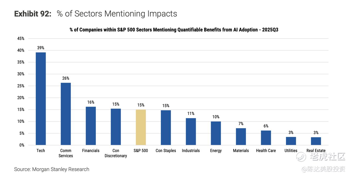 大摩最近有个研报,叫Momentum Around AI Adoption Is Building,核心观点是AI商业化应用拐点到来,AI能为企业创造可以量化的真金白银价值。通过几个可量化维度——1)财务影响:收入增长、成本节约、资本影响;2)生产力:运营与流程效率、整体绩效水平;3)销售与客户增长:营销有效性、客户参与度等等——在自己公司的财报里提到AI带来以上可量化维度改善的公司,比例持续增长。