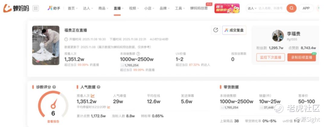 11月8日,李福贵在抖音开启了第一场助农带货直播。根据蝉妈妈数据,该场直播的观看人次达到13512万,直播间人数最多达到29万人,最受关注的商品是37.8元/5斤的黄小米,十分钟售出3.4万单,整场直播的销售额预估在2500万元-5000万元之间。