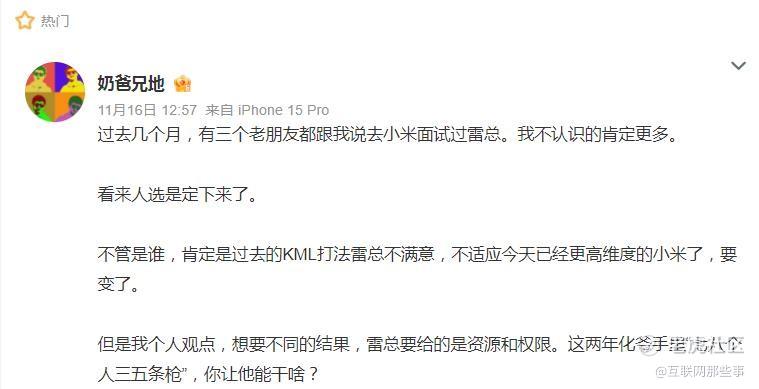 对广大吃瓜群众而言,最为好奇的一点,也恰恰在于一个被雷军点名表扬的十年老将,怎么说转岗就转岗?难道真如部分媒体、自媒体大V或直言或暗示的“王化对前阵子小米遭遇的极端负面舆情处置不力?”、“过去的KML打法雷总不满意”