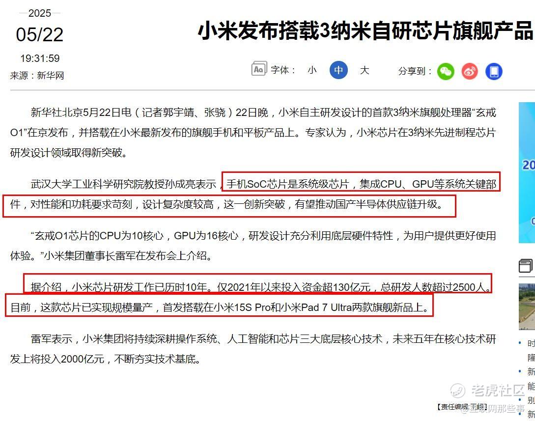 今年5月22日,小米玄戒01重磅发布,作为大陆首个3nm自主设计的智能手机SoC芯片,这一消息引发了举国轰动,国社更第一时间报道了这则喜讯,据新华社报道“据介绍,小米芯片研发工作已历时10年。仅2021年以来投入资金超130亿元,总研发人数超过2500人。目前,这款芯片已实现规模量产,首发搭载在小米15S Pro和小米Pad 7 Ultra两款旗舰新品上。”