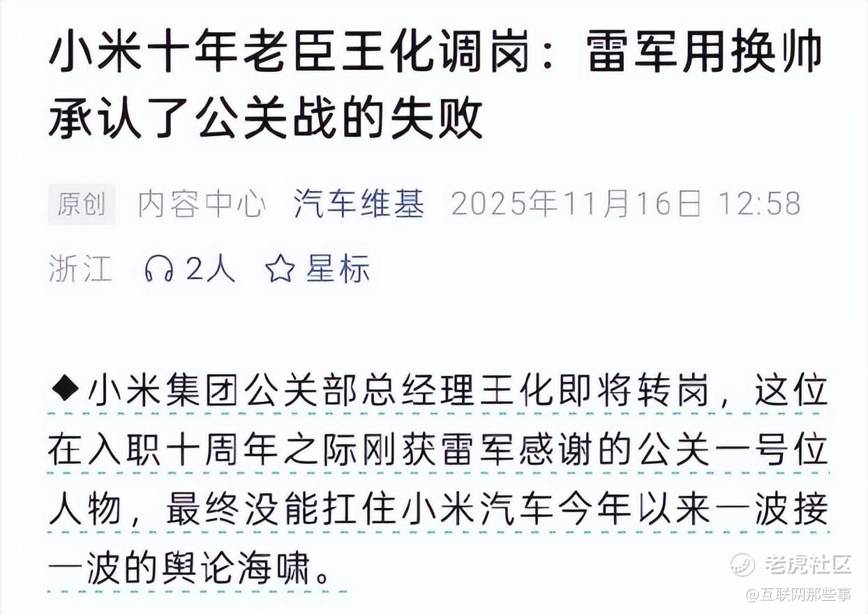 11月16日午后 ,多个媒体、自媒体大V援引媒体’电车界’报道:从业内多位人士处获悉“小米集团公关部总经理王化即将转岗,不再负责小米公关事务”。消息一出,很快在数圈码、科技圈和财金圈扩散开来。