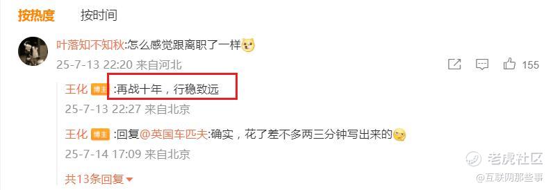 今年7月份,雷军公开场合表达了对王化的感谢之后,王化还在深夜单独发了一条微博表达对小米、对雷总、对过去十年遇至的伙伴和家人的感激,以及当有网友留言“怎么感觉跟离职了一样”时,王化第一时间回复“再战十年,行稳致远”。