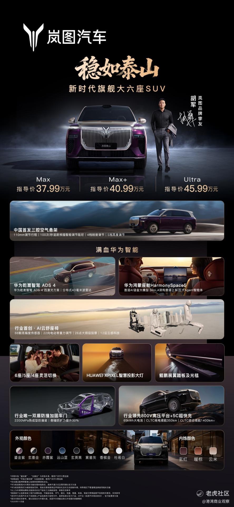 11月18日,岚图汽车在深圳国际会展中心召开以“争峰”为主题的新车发布会,正式发布新时代旗舰SUV——岚图泰山,新车共推出Max版、Max+版、Ultra版、黑武士版四大版型,官方指导价为37.99万元-50.99万元。同时,还公布了总价值4.8万元的上市权益。