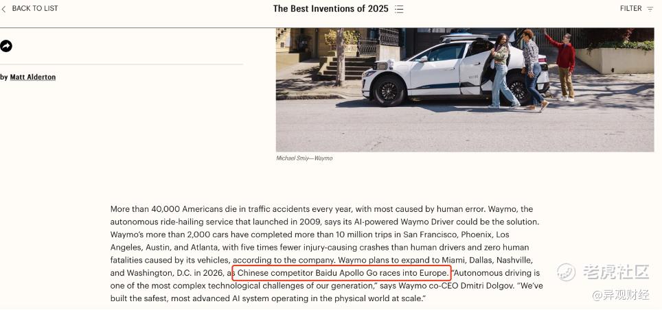 自动驾驶正在形成全球竞争的新格局。《时代周刊》将萝卜快跑视为Waymo的竞争对手,《财富》杂志也因其行业影响力“改变世界公司”榜单,标志着中国无人驾驶技术开始主动塑造全球战略节奏。萝卜快跑采取“技术平台+本地运营巨头”的模式,与Uber、Lyft合作输出整套无人运力系统,从而降低政策风险和运营成本,实现快速、可持续的规模化落地。