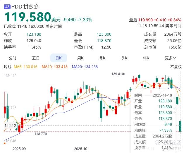 截至11月18日美股收盘,拼多多股价下跌7.33%至119.58美元/股,总市值1698亿美元,创下近三个月以来新低。作为对比,阿里巴巴股价159.72美元/股,总市值3811亿美元,两者的差距也在进一步拉开。
