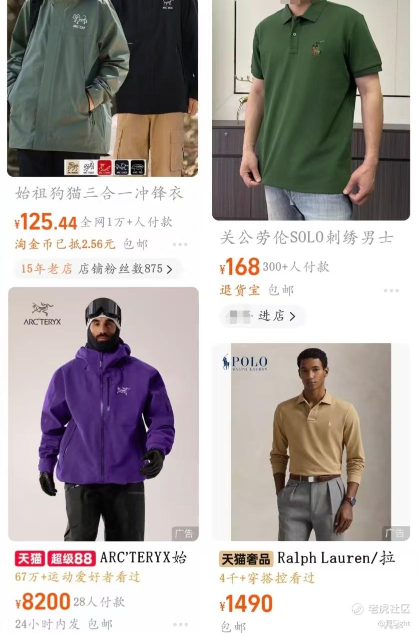 在淘宝、小红书等电商及社交平台上,例如始祖鸟、拉夫劳伦等的低仿、高仿服饰数不胜数。一百来块的始祖猫/狗/马、关公劳伦……依靠搞怪设计和比原版少了近乎一位数的低廉价格,部分仿品显示的付款人数甚至远超正品店铺产品。