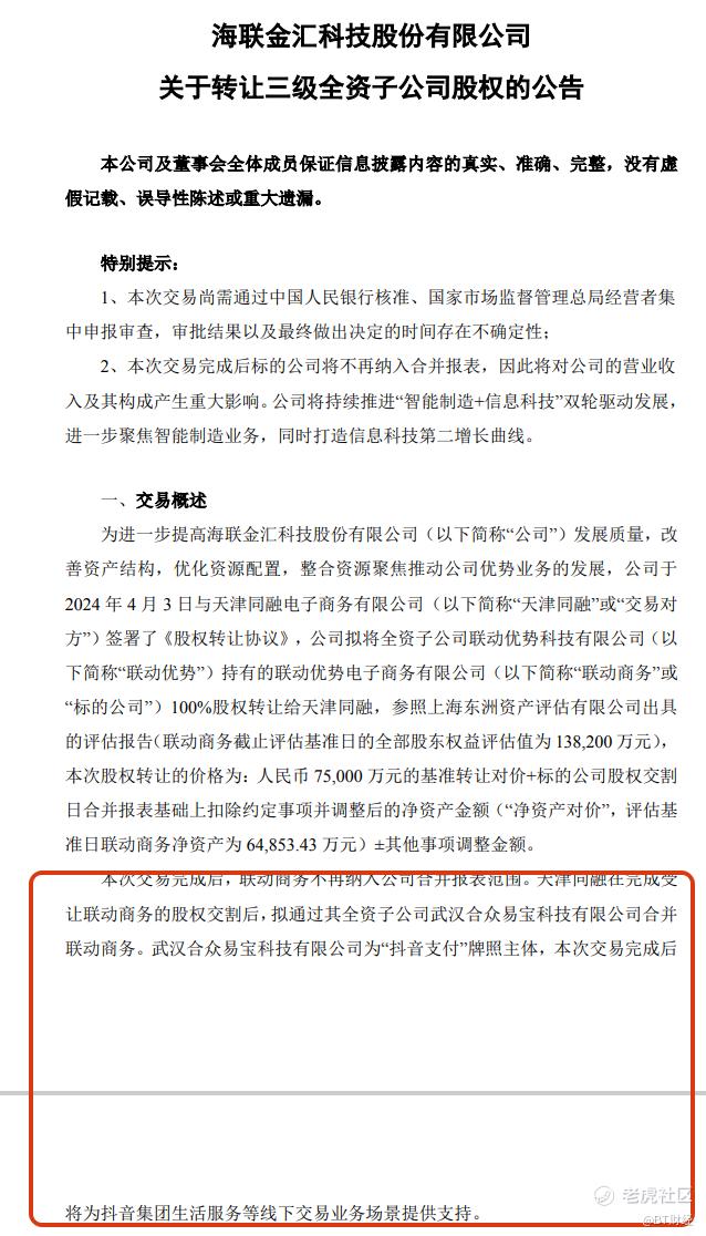 在张一鸣完成武汉合众易宝的改名之前,2024年4月3日A股上市公司海联金汇发布《关于转让三级全资子公司股权的公告》,该公告称将子公司联动优势转让给字节系公司天津同融,交易总金额约14亿元人民币。