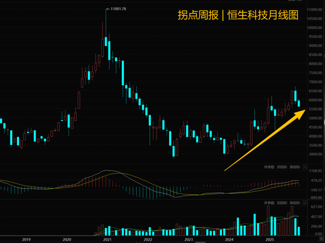 图:恒生科技指数月线图,上升趋势并未破坏,但最近调整2个月,投资者压力很大