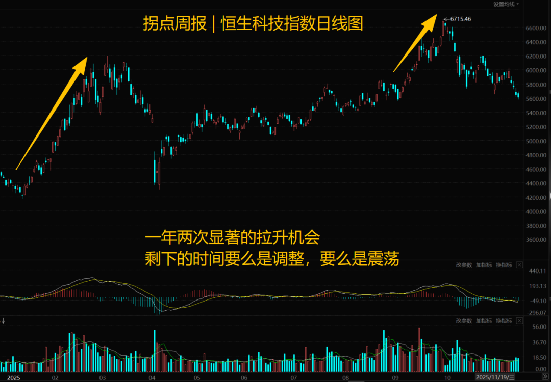图:恒生科技指数日线图,一年有两次较为显著的拉升行情,一次是上半年2月-3月,一次是8月-9月,每次快速拉升之后都出现了调整、震荡。
