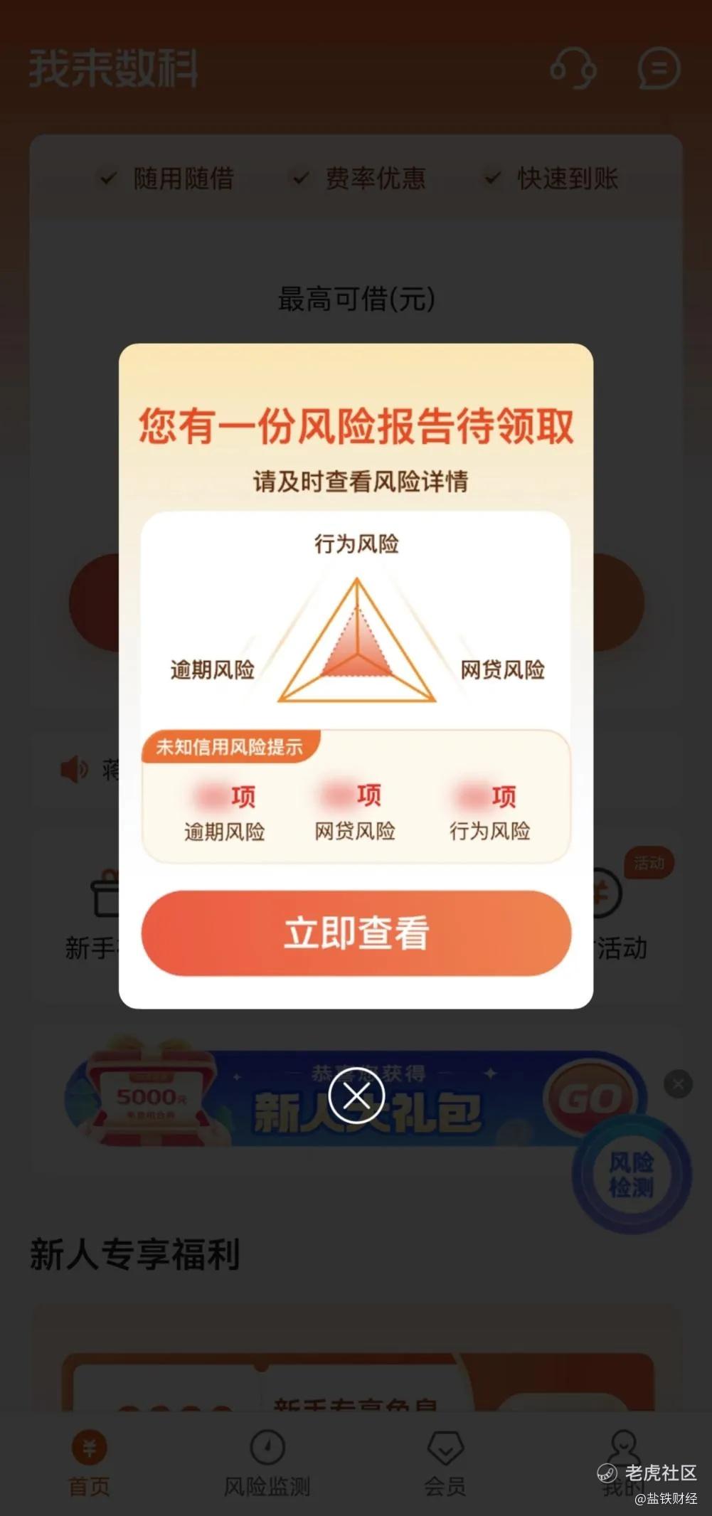 这还没完,在底部的导航栏,还有一个与“首页”“会员”“我的”并列的“风险监测”。
