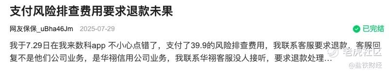 在消费保上,也有用户表示,“我于7月29日在我来数科app不小心点错了,支付了39.9的风险排查费用,我联系客服要求退款,客服回复不是他们公司业务,是华祤信用公司业务,我联系华祤客服没人接听,要求退款处理…”
