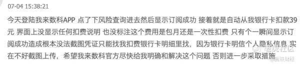 另一名用户反映,“今天登录我来数科APP,点了下风险查询进去,然后显示订阅成功,接着就是自动从我银行卡扣款39元,界面上没显示任何扣费说明,也没标注这个费用是包月还是一次性扣费,只有个一瞬间显示订阅成功,造成根本没法截图凭证。”