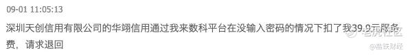 一名用户在黑猫投诉上投诉称,“深圳天创信用有限公司的华翊信用,通过我来数科平台在没输入密码的情况下扣了我39.9元服务费,请求退回。”