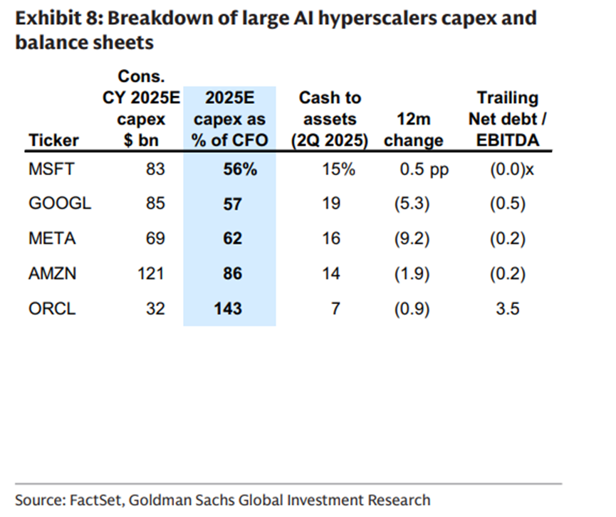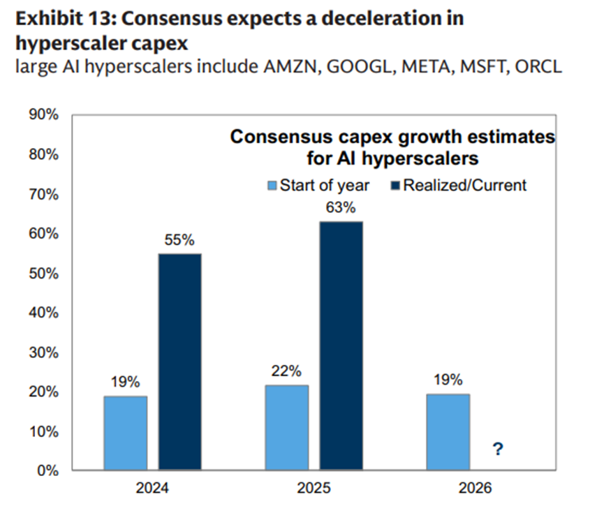 目前对于2026年AI的Capex预期增速依然是20%左右,这意味着超过5000亿美元的投资,当然我知道会有人期望说明年还能有60%的增速,但我觉得这太难了,一些企业已经消耗了70%的经营性现金流,如果20%-30%的利润增速,Capex增速预期再上升60%。这意味着这些企业要消耗90%的经营性现金流,这肯定意味着更多的其他业务裁员,以及真正意义上的All in AI了。