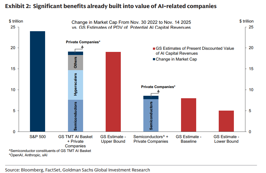 另一个我觉得比较公允的看法是,也是之前说过的,当下美国经济的风险,小于它市场的风险,因为假定说,有一天突然有一个巨大的黑天鹅,美国AI的Capex从4000亿一年变成了0,在这个情况下,我们会看到很多Priced in的预期回流。