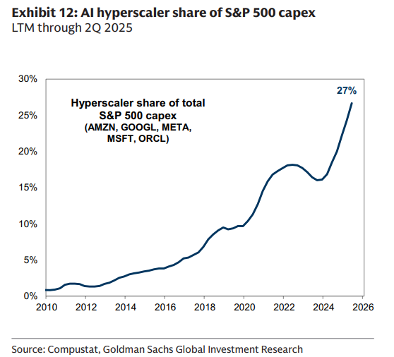 在这个下行中,有一个板块异军突起,就是前面说的AI投资,投资额从2023年的占据美国GDP约0.5-1%,到2024年的占据美国GDP的1.0-1.5%。这个东西的存在,部分导致了2022-2024年的美国例外论。因为只有美国有这个东西。(还有一个原因是美国的强财政)