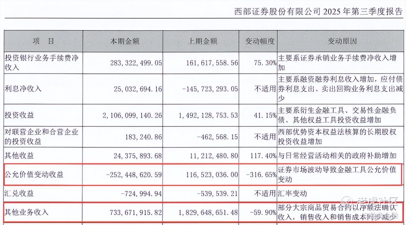 西部证券成为唯一一家营收下降的A股券商,主要受两大因素影响:一是公允价值变动收益由2024年同期的盈利1.17亿元变成亏损2.52亿元,较2024年同期减少3.69亿元。根据西部证券解释,主要因证券市场波动导致金融工具公允价值变动。二是其他业务收入7.34亿元,较2024年同期减少10.96亿元,降幅59.9%,主要因部分大宗商品贸易合约以净额法确认收入,销售收入和销售成本同步减少。