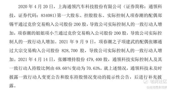 据悉,项春潮的配偶郑锡平通过竞价交易购入公司股份200股,导致公司实际控制人的一致行动人增加,项春潮的姐姐项小兰通过竞价交易购入公司股份200股,导致公司实际控制人的一致行动人增加。2021年9月9日,项春潮之子项建武的配偶张娜通过大宗交易购入公司股份82.87万股,导致公司实际控制人的一致行动人增加。2021年4月14日,张娜增持股份47.94万股,通领科技实际控制人及其一致行动人持股比例由69.60%变动为70.63%。就上述情况,通领科技未及时披露一致行动人变更公告和股东持股情况变动的提示性公告,后进行补充披露。