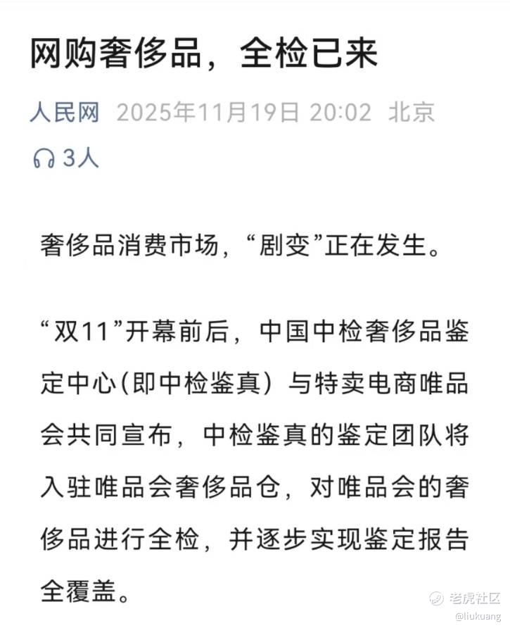 其二,便是解决了消费者对于正品问题的担忧。双11期间,唯品会全面接入了中国中检正品管理库,成为首个实现奢侈品100%全检的电商平台。驻仓鉴定师团队采用“3名鉴定师交叉鉴定+总部复核”的三重保障机制,逐步实现“一物一鉴一报告”全覆盖。