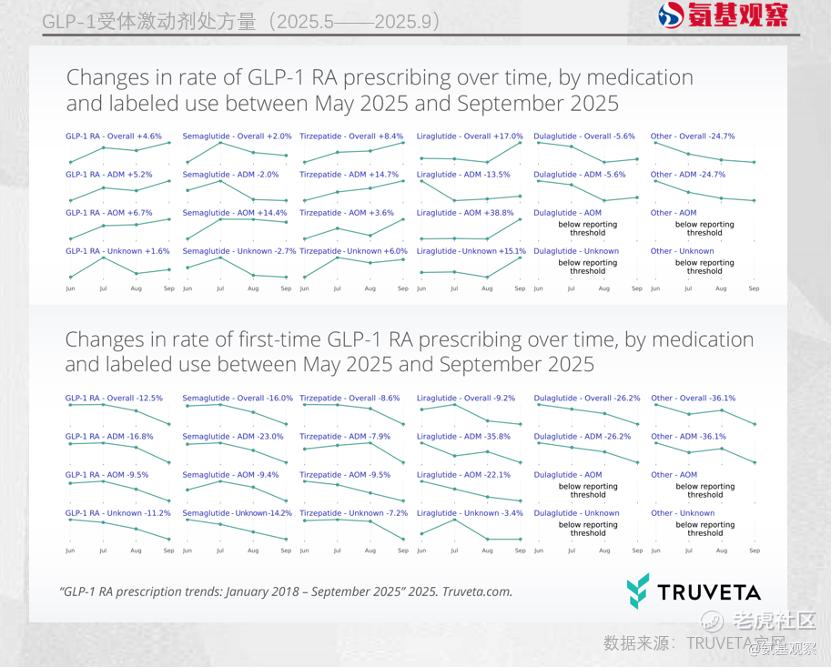 Tirzepatide的环比增速跌至个位数,Semaglutide单季度销售额转为负增长;第三方数据也显示,美国GLP-1药物9月份的处方量出现两位数下滑,这是自今年6月以来首次出现此类情况。