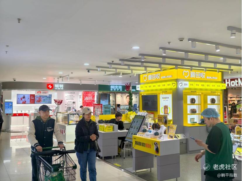 如图所示,在这个商场的爱回收旁边,紧挨着最近几个月在抖音上投流很猛的转转;除了图里的两家回收商外,还有一家相对小规模的手机回收商在不远处,角度问题没能拍到图里。先说结果,在三家中,爱回收给到的手机回收价格最高,比转转高出5%,比那一家手机回收商高出15%以上。