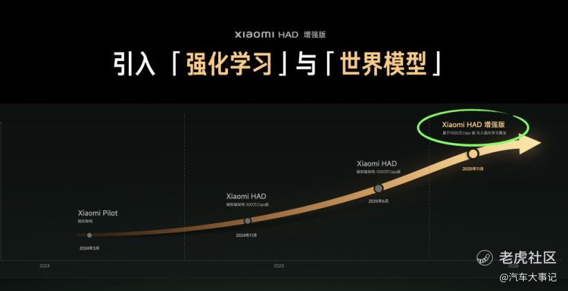 11月21日,小米汽车在广州车展召开Xiaomi HAD增强版发布会。作为今年6月小米YU7搭载1000万Clips端到端辅助驾驶版本后的又一重要突破,此次升级首次引入「强化学习 + 世界模型」的大模型训练方法,将带来三大行车能力的全面提升:纵向加减速更丝滑、横向变道更果断、路口选择更精准。该版本将于广州车展后,通过OTA HyperOS 1.11 系列陆续推送给用户。