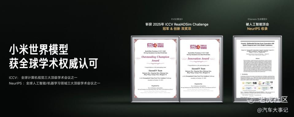 小米世界模型已获得全球学术权威的充分认可:小米的ViSE 算法在 ICCV 2025 - 自动驾驶方向仿真合成数据专业挑战赛中荣获冠军;小米生成模型的相关论文被NeurIPS 所收录。ICCV是全球计算机视觉三大顶级学术会议之一,NeurIPS是全球人工智能/机器学习领域三大顶级学术会议之一。