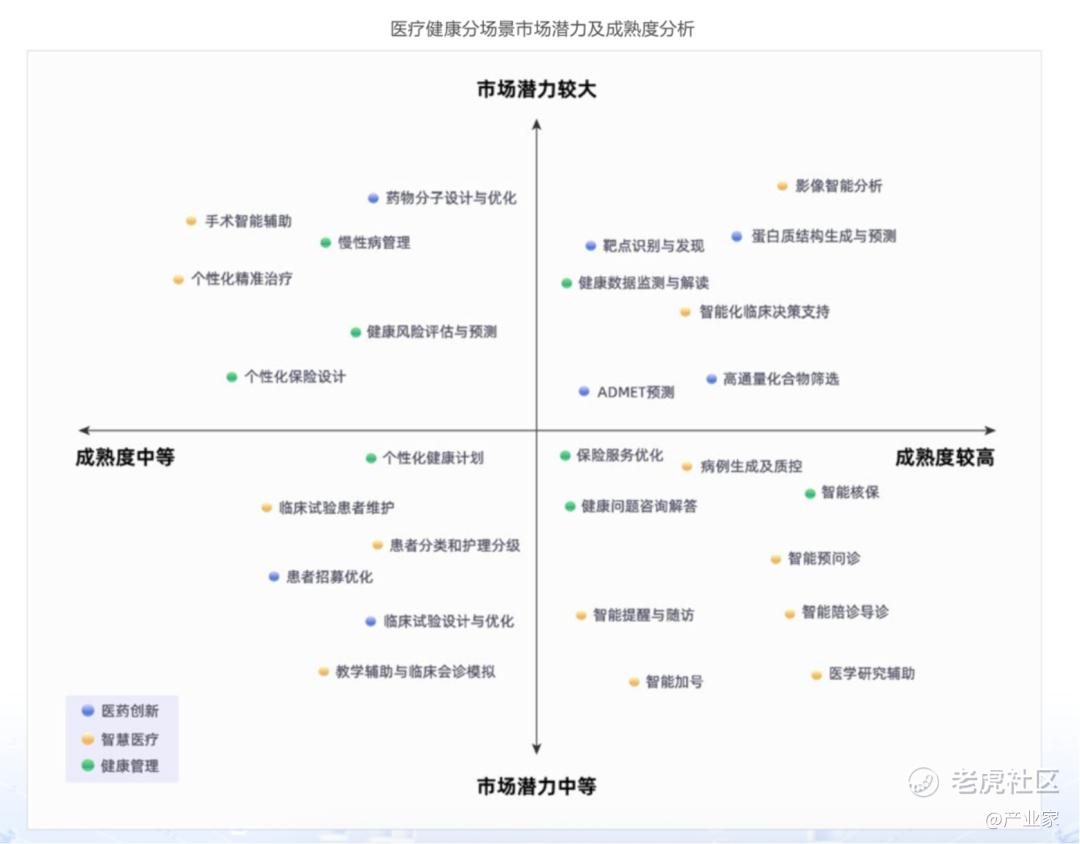 AI 在CT影像中辅助筛查肺结节已经是行业里技术最成熟的应用之一,数据显示部分项目的准确率甚至可达99%,显著提升阅片效率、降低漏诊风险。在阿里云发布的疗健康分场景市场潜力及成熟度分析中,影像智能分析显示为成熟度最高、市场潜力最大的细分场景。