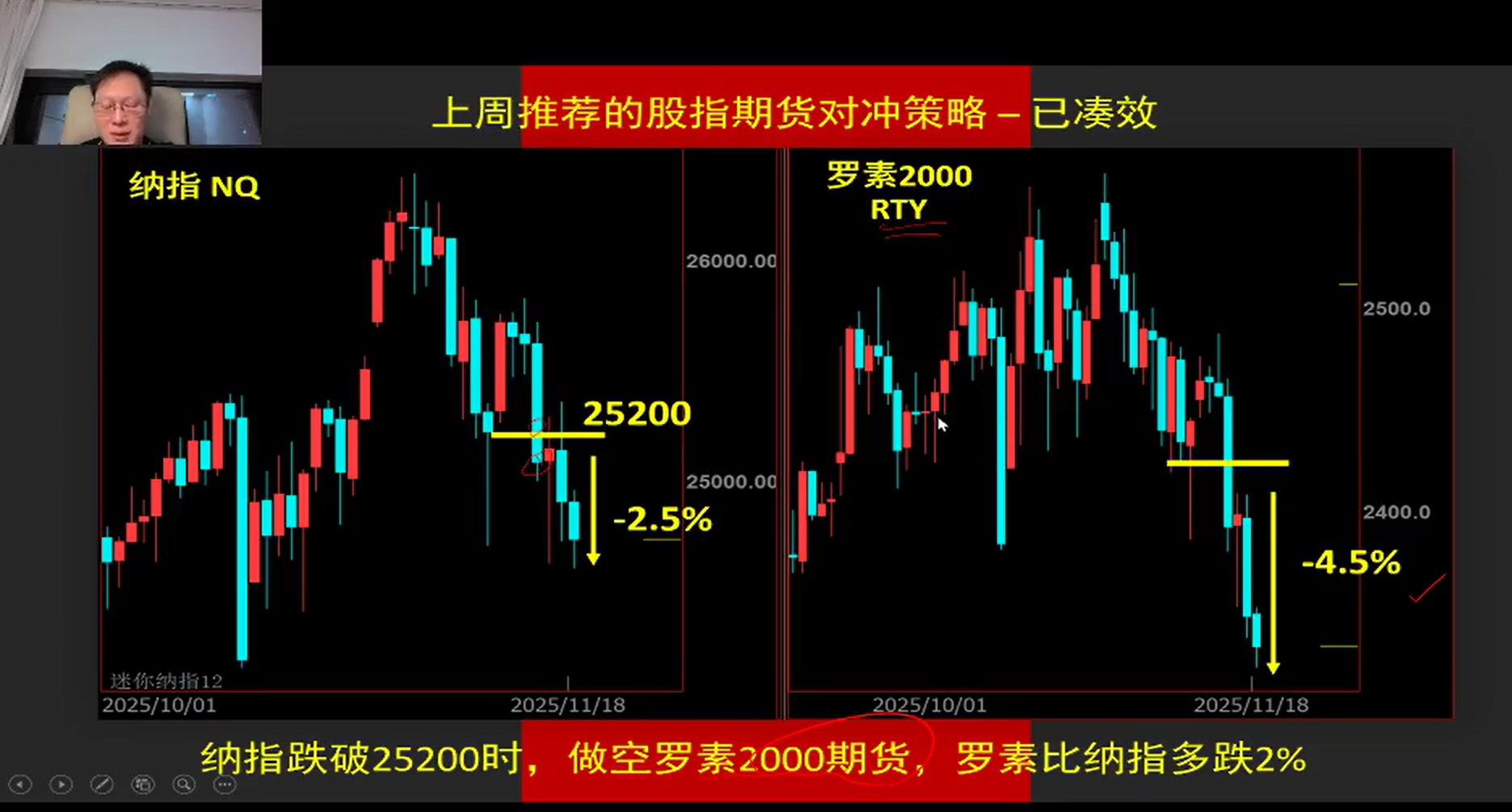 本章节说话人分享市场行情及策略。今日将发布9月美国非农数据,其因政府停摆滞后,对市场走向影响权重较大。回顾上周纳指策略,建议跌破20天均线时对冲,以罗素2000指数做空对冲有效盈利。给出纳指首个支撑位24200左右,已持对冲组合者可继续持有,未做对冲者建议关注。