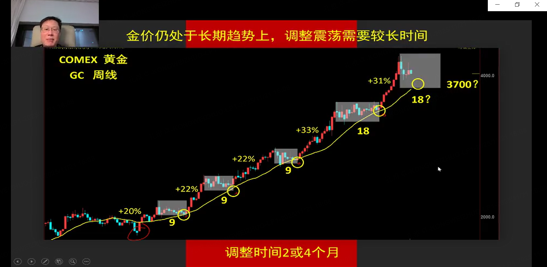 本章节主要讨论黄金价格走势。说话人指出长期金价有自身运行规律,20周均线是关键支撑,未跌破该均线不能认为黄金走空头趋势。目前金价处于9 - 18周震荡阶段,震荡区间约10%,可能是阶段性抄底机会,也可能区间波动,倾向认为当前金价仍有调整空间和时间。
