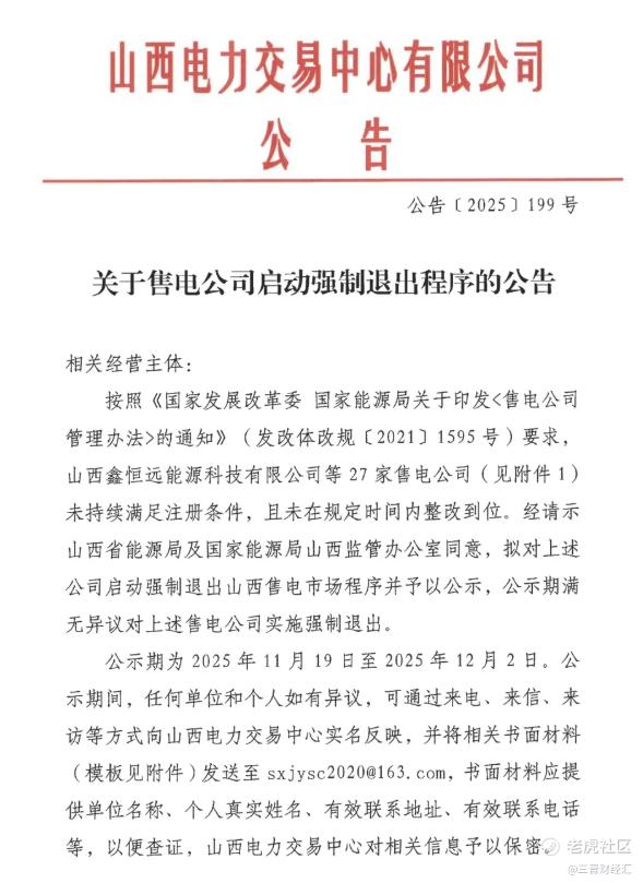 11月19日,山西电力交易中心发布关于《售电公司启动强制退出程序的公告》。