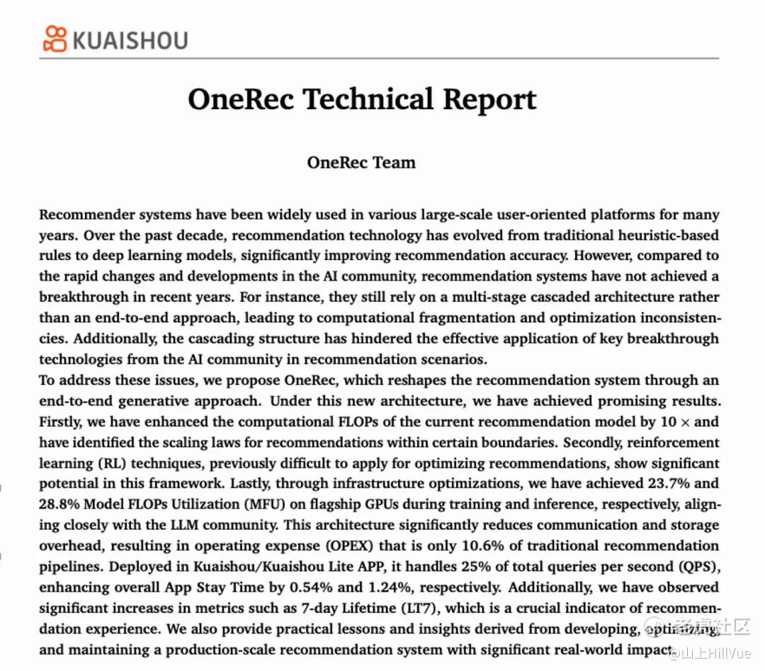 快手推出的 OneRec 是行业中首次采用端到端生成式 AI 架构的推荐大模型,从底层真正改造了传统推荐系统的弊病。一方面,一体化的推荐架构带来的有效计算量提升 10 倍,让推荐更加精准。另一方面,架构创新大幅提升了训练和推理的算力利用率,运营成本仅为传统方案的 10.6%。