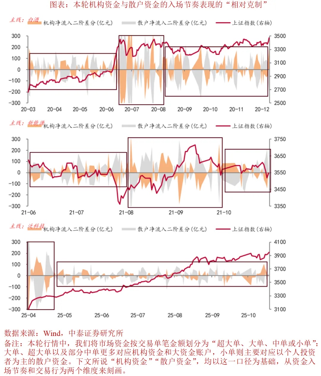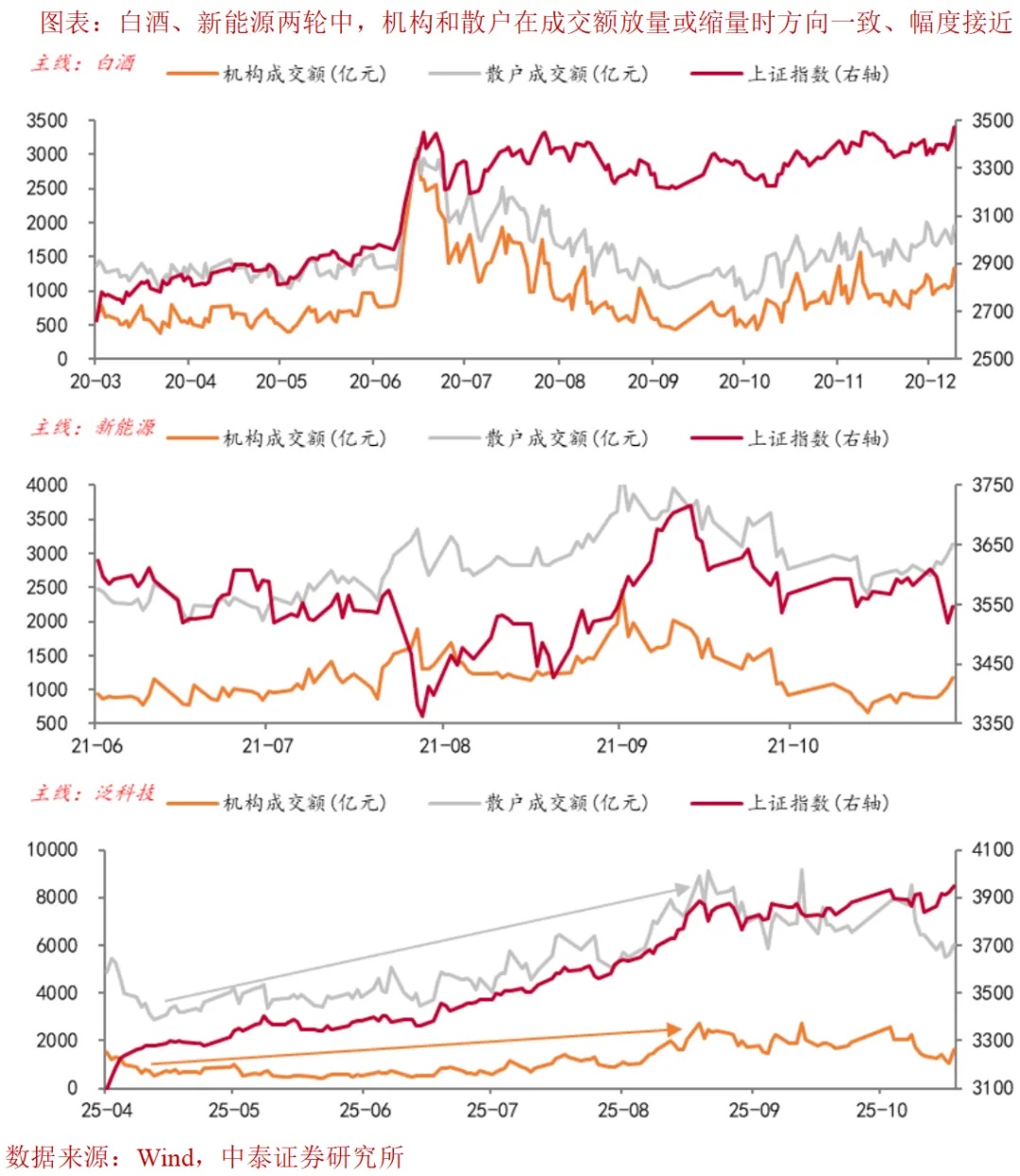 为了探明本轮行情中机构与散户资金的表现特征,以2020 年以来的20 年白酒消费、21 年新能源、25 年科技这三轮主线行情做对比分析。可以发现:白酒、新能源两轮中,机构和散户在成交额放量或缩量时方向一致、幅度接近,基本是“机构先行、散户追随”,随后一起加速、一起退潮,成交额波动大、节奏演绎比较快。