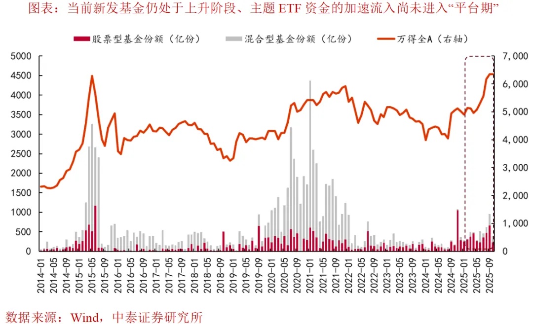 而当前新发基金仍处于上升阶段、主题ETF资金的加速流入尚未进入“平台期”,主线行情的资金面支持依然充足。这意味着,至少在短期内,市场主线的延续性较强,增量资金仍有望对行情形成推动。