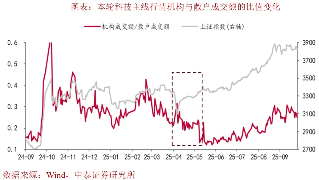 对比来看,在“924行情”中,机构成交额与散户成交额的比值走势与指数呈显著正相关,即机构成交额相对越大,指数涨幅越强,体现出典型的机构主导型上涨。然而,在本轮25年4月启动的行情以来,这一相关性转为负向,散户的成交额相对机构放量更大,成为推动指数上扬的核心力量。这表明本轮行情的启动始于大量逐步敲入的买单合力,散户或小单的定价权在起始阶段便超过了机构或超大单,体现出本轮行情由多方资金合理推动的结构性特征。