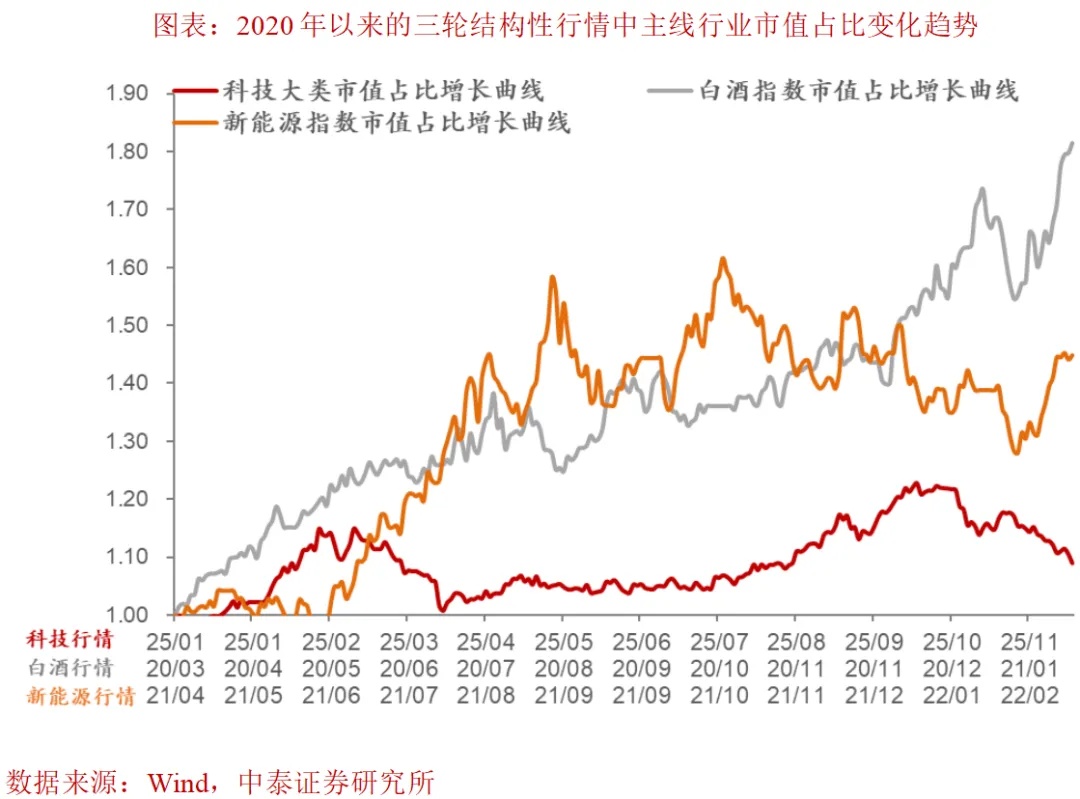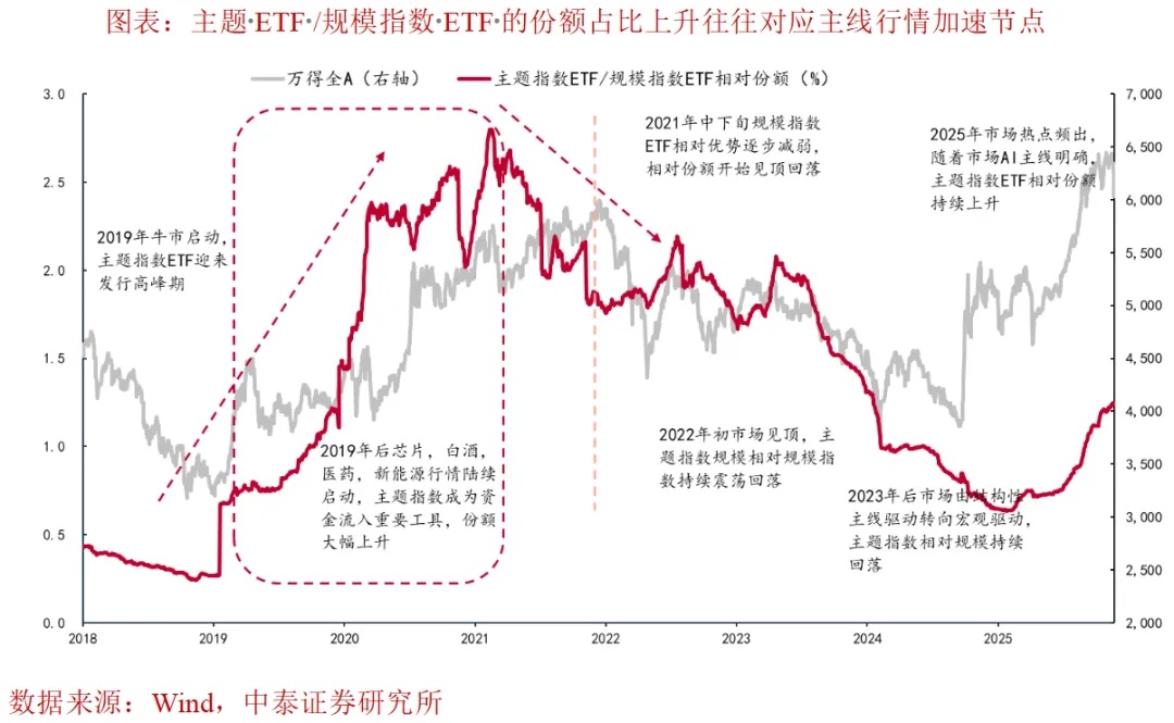 以 2019–2021 年白酒、新能源等主线行情为代表的上一轮结构性牛市经验表明:当行业与主题 ETF 相对规模指数 ETF 的份额占比快速上升时,往往对应主线明确、资金集中、行情处于扩散和加速阶段;当该指标见顶回落,叠加市场主线或头部 ETF 资金进入平台期甚至转为净流出时,通常意味着主线板块的赚钱效应边际减弱,市场或从单边上行转入高位震荡与结构分化。