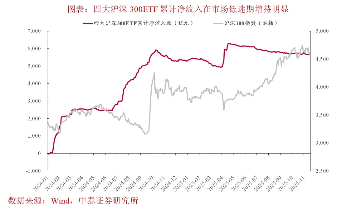 四大沪深300ETF自2024年初以来累计净流入快速上升,在沪深300指数大幅震荡过程中,累计净流入速度明显加快,截至2025年10月仍接近5800亿元,没有出现明显的快速流出。更重要的是,这种增长体现了中长线资金作为“耐心资本”夯实市场底部的特征。