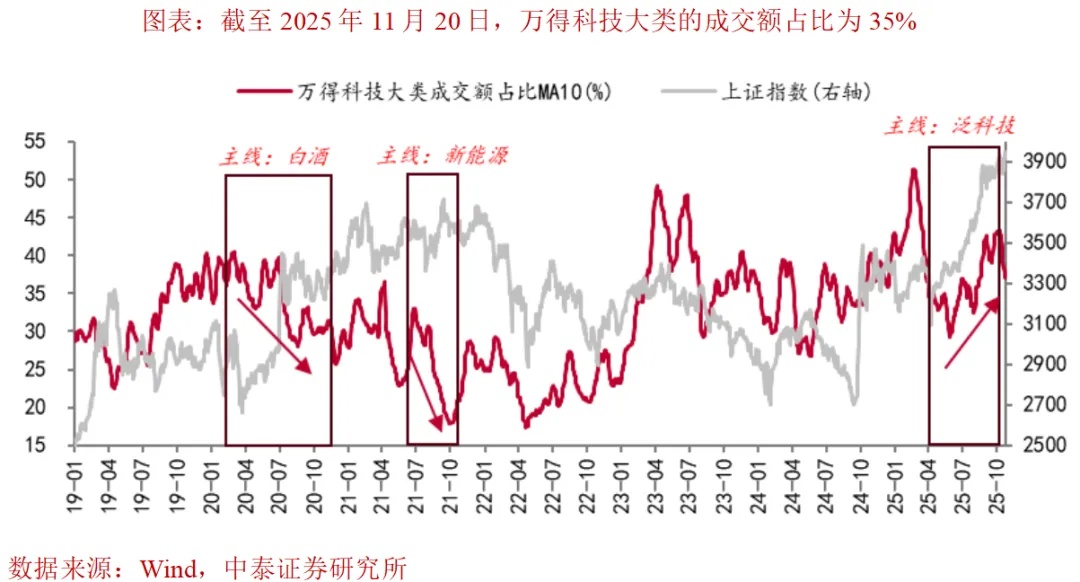 截至2025年11月20日,万得科技大类的成交额占比为35%,处于历史10年的75%分位数。
