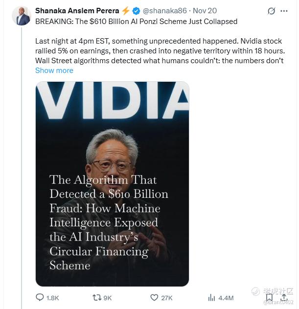 最具代表性的就是X上Shanaka Anslem Perera那条爆火的帖子——《6100 亿美元的AI庞氏骗局刚崩塌了》。