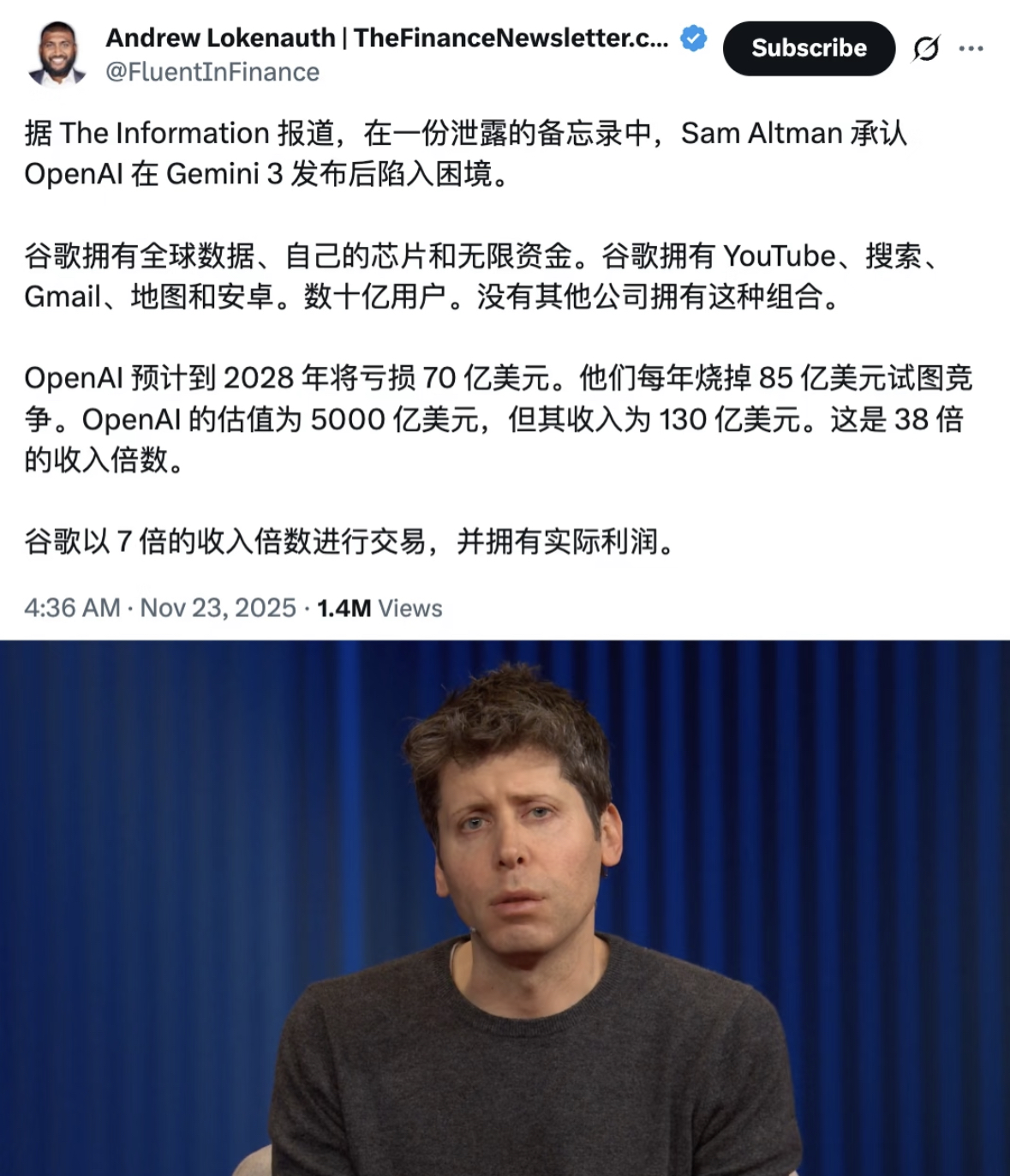 上周五市场在交易“谷歌 beats OpenAI”——Gemini 3性能超越OpenAI最新大模型+训练全部使用的是谷歌自研的TPU, $谷歌A(GOOGL)$ 收创历史新高, $英伟达(NVDA)$ 小跌。加之Sam Altman承认OpenAI处于“逆风局”,难道AI叙事的逻辑要变了吗?[疑问]