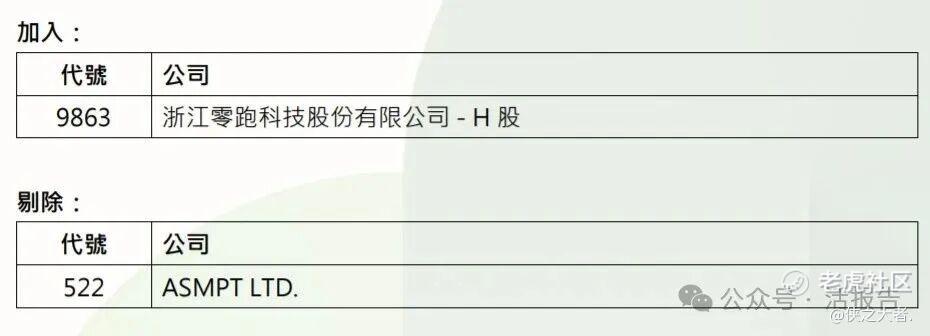 恒生科技指数成份股加入零跑汽车(9863.HK),剔除ASMPT(0522.HK),成份股数目维持30只。