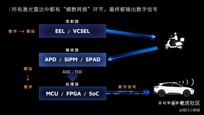 针对行业中“数字激光雷达和模拟激光雷达”相关错误分类,禾赛指出,所有的激光雷达都是“数字激光雷达”。当前所有激光雷达的工作模式中都有一环是“模数转换”,且最终都输出数字信号,工作原理都和数码相机类似。行业里主流使用的 APD、SiPM、SPAD 三种激光探测技术没有任何技术优劣之分,就像现阶段做纯电的车企也可以做增程,做增程的车企也可以做纯电,都是新能源技术类型,不能说哪种技术更领先,只有哪种技术更适合用户。