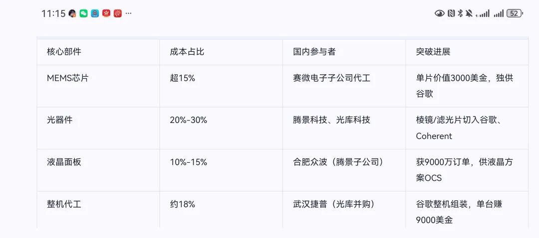 | 液晶面板 | 10%-15% | 合肥众波(腾景子公司)| 获9000万订单,供液晶方案OCS |