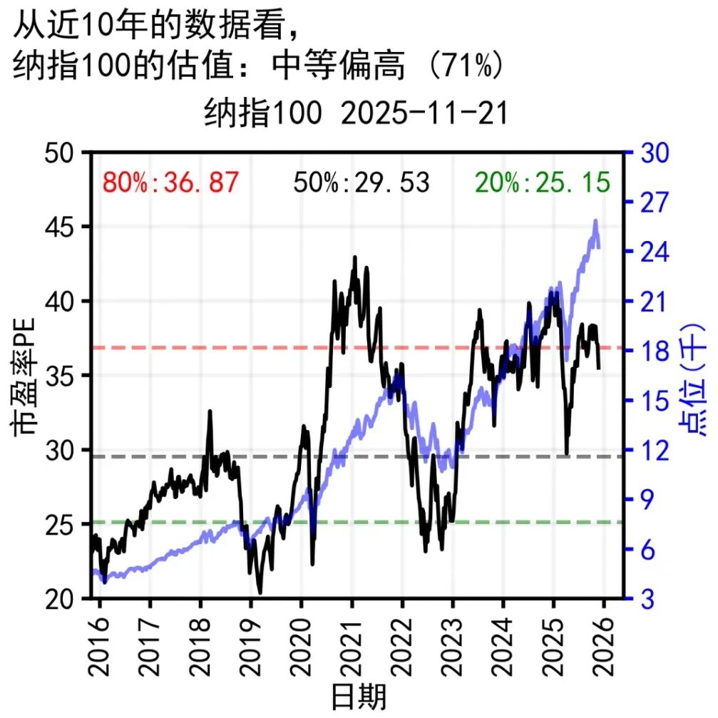 最近,纳指100迎来了新一轮的下跌,估值重新回落到了中等偏高(第86期 全球指数估值与个人记录 2025.11.22)。