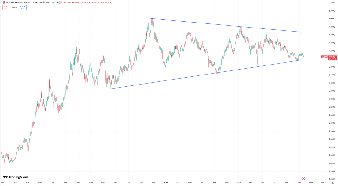 利率终究会有一个趋势,在历史上大部分时候利率都不是区间震荡的,而我们已经处在这个震荡里面快3年了。纯看图,这种四分之三或者三分之二处也是可以突破的位置。